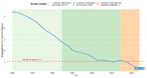 Türkiye’nin demografik dönüşümünün seyri ve 1.48 seviyesine giden tarihsel yolculuk Şekil 1‘de detaylandırılmıştır. Grafik incelendiğinde, düşüş eğiliminin doğrusal olmadığı, aksine üç farklı “kırılma” dönemi içerdiği görülmektedir: