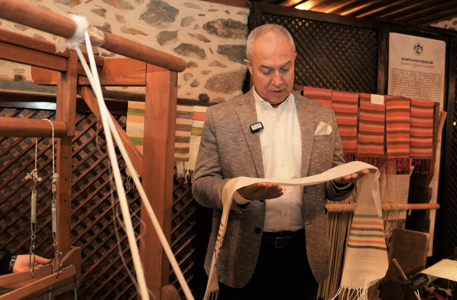 Başkan Özçelik, Belediye Başkan Yardımcısı Murat Levent Koçak ve Başkan Danışmanı Sadık Dizdaroğlu ile birlikte atölyeyi ziyaret ederek üretim sürecine ilişkin incelemelerde bulundu. Hasanağalar Konağı’nda 5 tezgahta sürdürülen çalışmalarda, ipek ve muz lifinden çeşitli ürünler üretiliyor. Atölyede dokunan ipek güğül şallar, yaka mendilleri ve fularlar, resmi temaslarda Alanya adına hediye edilen ürünler arasında yer alıyor.