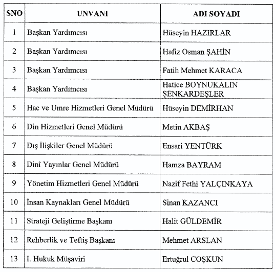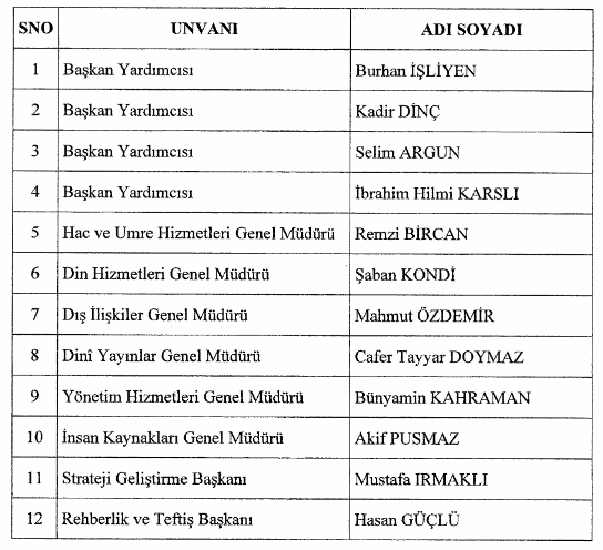 İlk listede yer alan, Diyanet İşleri Başkanlığı üst kademe kamu yöneticileri görevden alınırken, ikinci listede yer alan üst kademe kamu yöneticiliklerine hizalarında belirtilen kişiler atandı ve üçüncüılı listede yer alan üst kademe kamu yöneticiliklerine hizalarında belirtilen kişiler görevlendirildi.