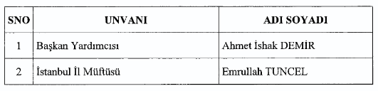 Resmi Gazete’de yayımlanan karara göre, Diyanet İşleri Başkanlığı Din İşleri Yüksek Kurulu üyeliğine, Doç. Dr. Bayram Köseoğlu, Doç. Dr. Mustafa Çakır, Dr. Fatih Mehmet Aydın, Dr. Yahya Solmaz, Tahir Tural, Lokman Arslan atandı.
