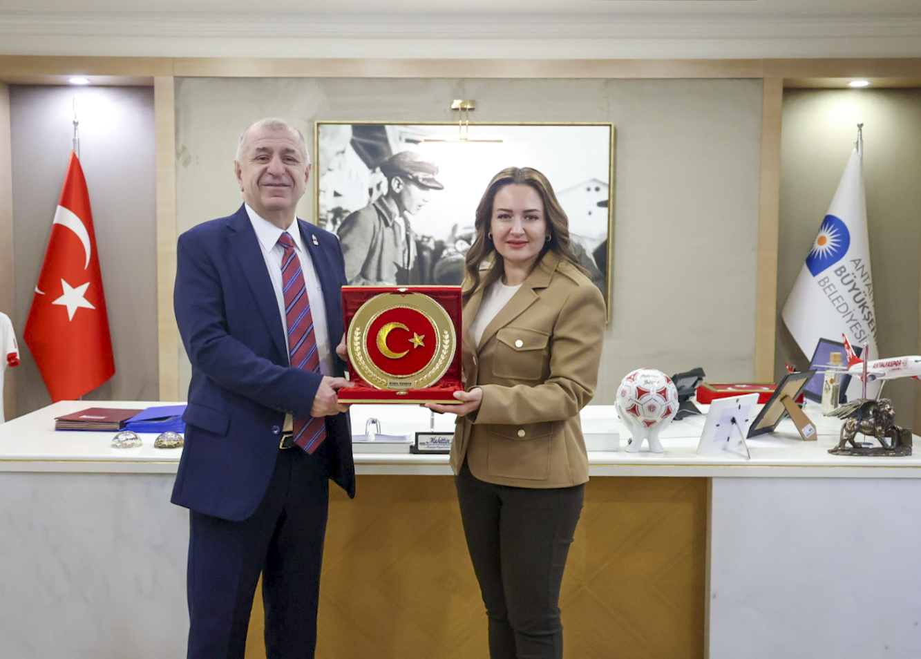Antalya Büyükşehir Belediyesi’ni ziyaret eden Zafer Partisi Genel Başkanı Özdağ’ı Antalya Büyükşehir Belediyesi Başkan Vekili Büşra Özdemir ve belediye bürokratları karşıladı.