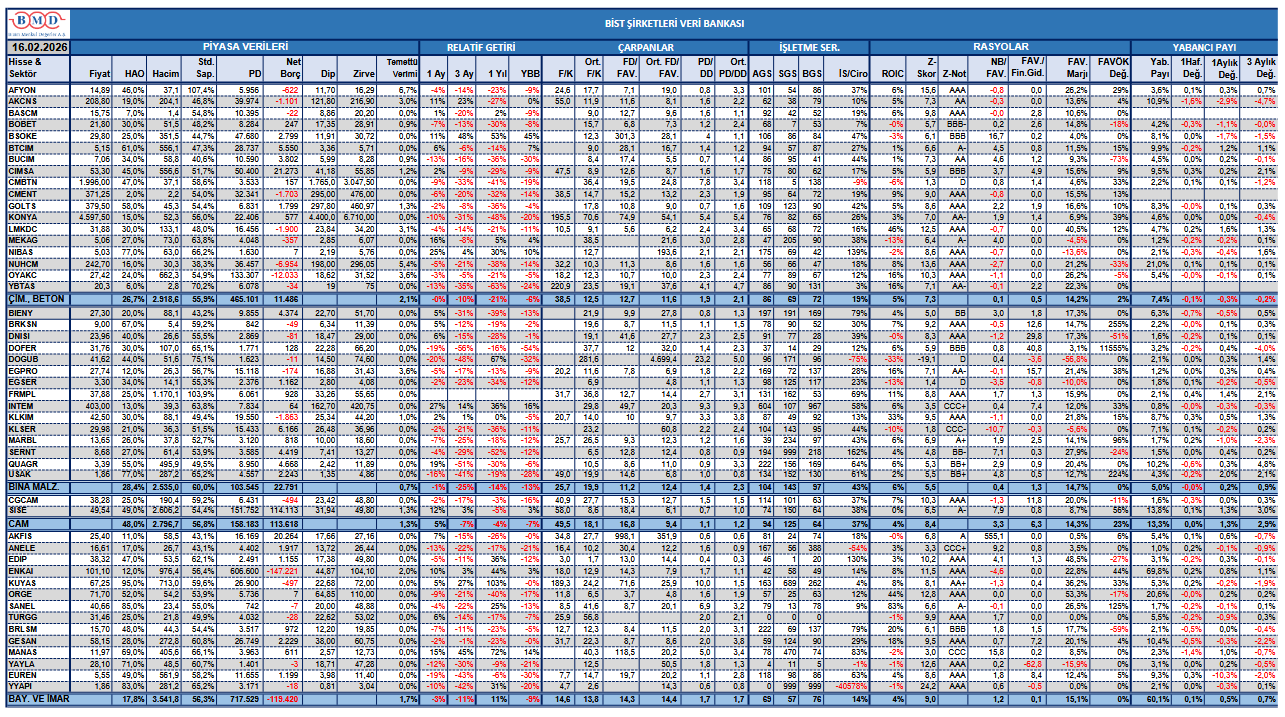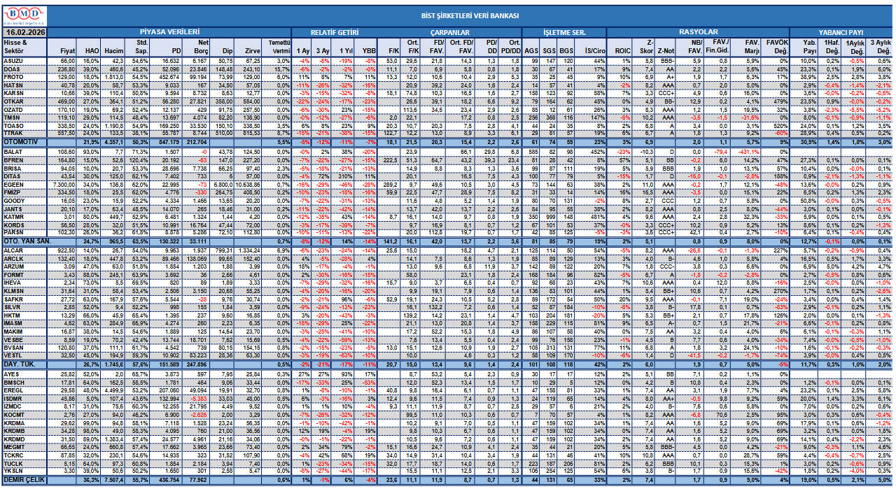 BMD Araştırma’nın raporunda göre, Borsa İstanbul’da işlem gören şirketlerin sektörleri, halka açıklık oranı, ortalama hacim, son bir yıllık dip ve zirve fiyatları gibi piyasa verilerini; BİST 100 endeksine göre göreceli getirilerini; F/K, FD/FAVÖK ve PD/DD çarpanlarının cari ve ortalama değerlerini; alacak stok ve borç gün süreleri ile işletme sermayesi/ciro oranını; ROIC, Z-Skor, Net Borç/FAVÖK gibi rasyoları ve yabancı payı değişimlerini gösteren veri bankası şu şekilde: