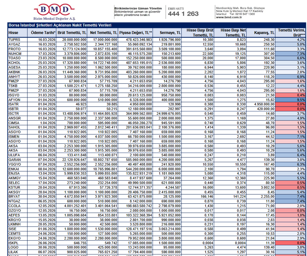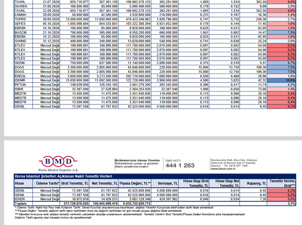 BMD Araştırma’nın değerlendirmesine göre, 2025 yılı kârından temettü dağıtımına dair yönetim kurulu kararı almış BİST şirketlerinin dağıtmayı planladığı nakit temettü tutarı, temettü dağıtım tarihi ve temettü verileri şöyle: