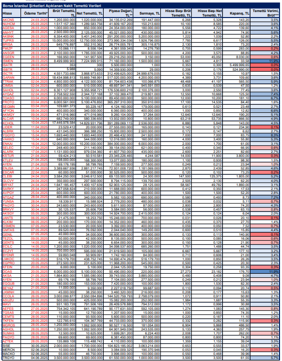 2024 yılı karından temettü dağıtımına dair Yönetim Kurulu kararı almış BİST şirketlerinin dağıtmayı planladığı nakit temettü tutarı, temettü dağıtım tarihi ve temettü verimleri şu şekilde: