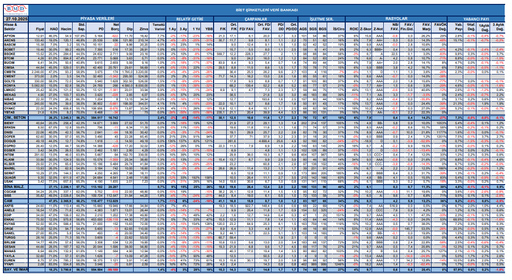 BMD Araştırma’nın raporunda göre, Borsa İstanbul’da işlem gören şirketlerin sektörleri, halka açıklık oranı, ortalama hacim, son bir yıllık dip ve zirve fiyatları gibi piyasa verilerini; BİST 100 endeksine göre göreceli getirilerini; F/K, FD/FAVÖK ve PD/DD çarpanlarının cari ve ortalama değerlerini; alacak stok ve borç gün süreleri ile işletme sermayesi/ciro oranını; ROIC, Z-Skor, Net Borç/FAVÖK gibi rasyoları ve yabancı payı değişimlerini gösteren veri bankası şu şekilde: