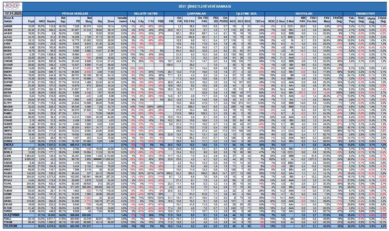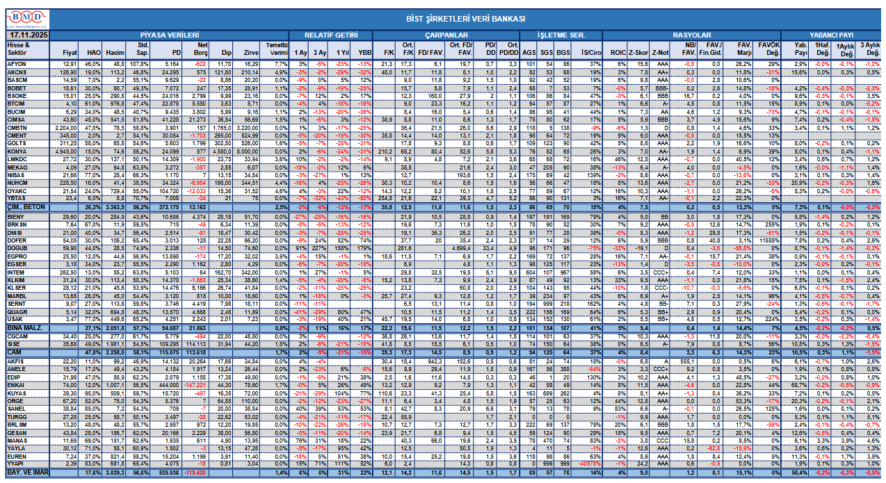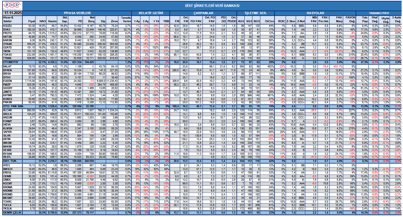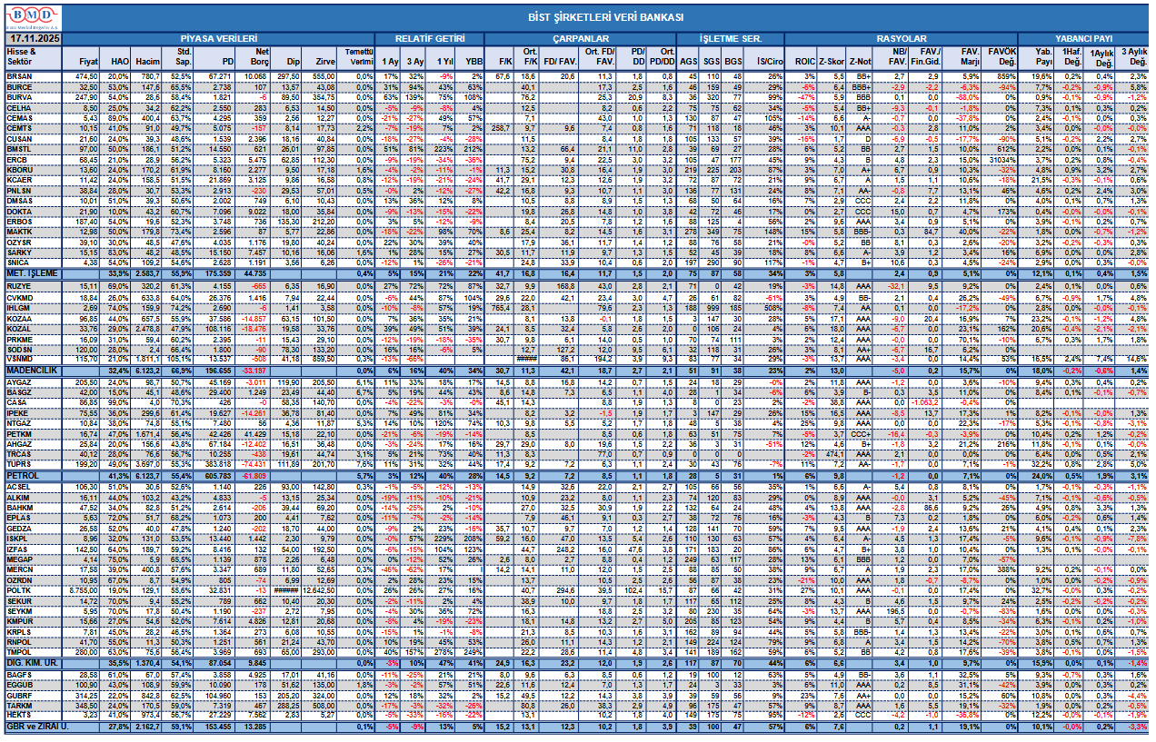 BMD Araştırma’nın raporunda göre, Borsa İstanbul’da işlem gören şirketlerin sektörleri, halka açıklık oranı, ortalama hacim, son bir yıllık dip ve zirve fiyatları gibi piyasa verilerini; BİST 100 endeksine göre göreceli getirilerini; F/K, FD/FAVÖK ve PD/DD çarpanlarının cari ve ortalama değerlerini; alacak stok ve borç gün süreleri ile işletme sermayesi/ciro oranını; ROIC, Z-Skor, Net Borç/FAVÖK gibi rasyoları ve yabancı payı değişimlerini gösteren veri bankası şu şekilde: