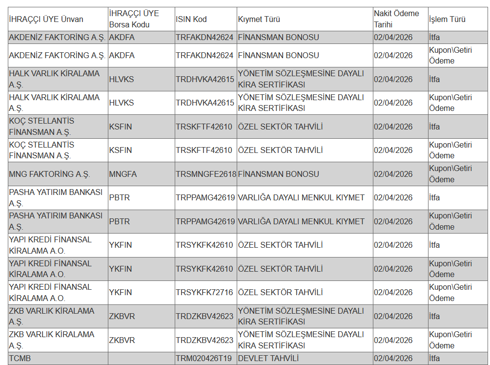 Borçlanma araçları, yatırım fonları ve varant itfa/kupon/getiri/ nakdi uzlaşı ödeme işlemlerine ilişkin bildirim yapıldı.