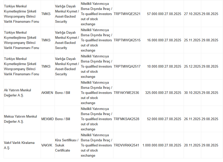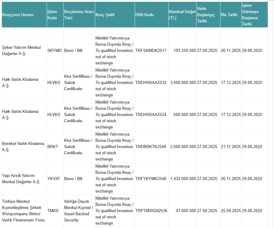 Kamuyu Aydınlatma Platformuna (KAP) yapılan açıklamaya göre, Borçlanma Araçları Piyasası Kesin Alım Satım Pazarı'nda işlem görmeye başlayacak borçlanma araçları / kira sertifikaları bilgileri şu şekilde: