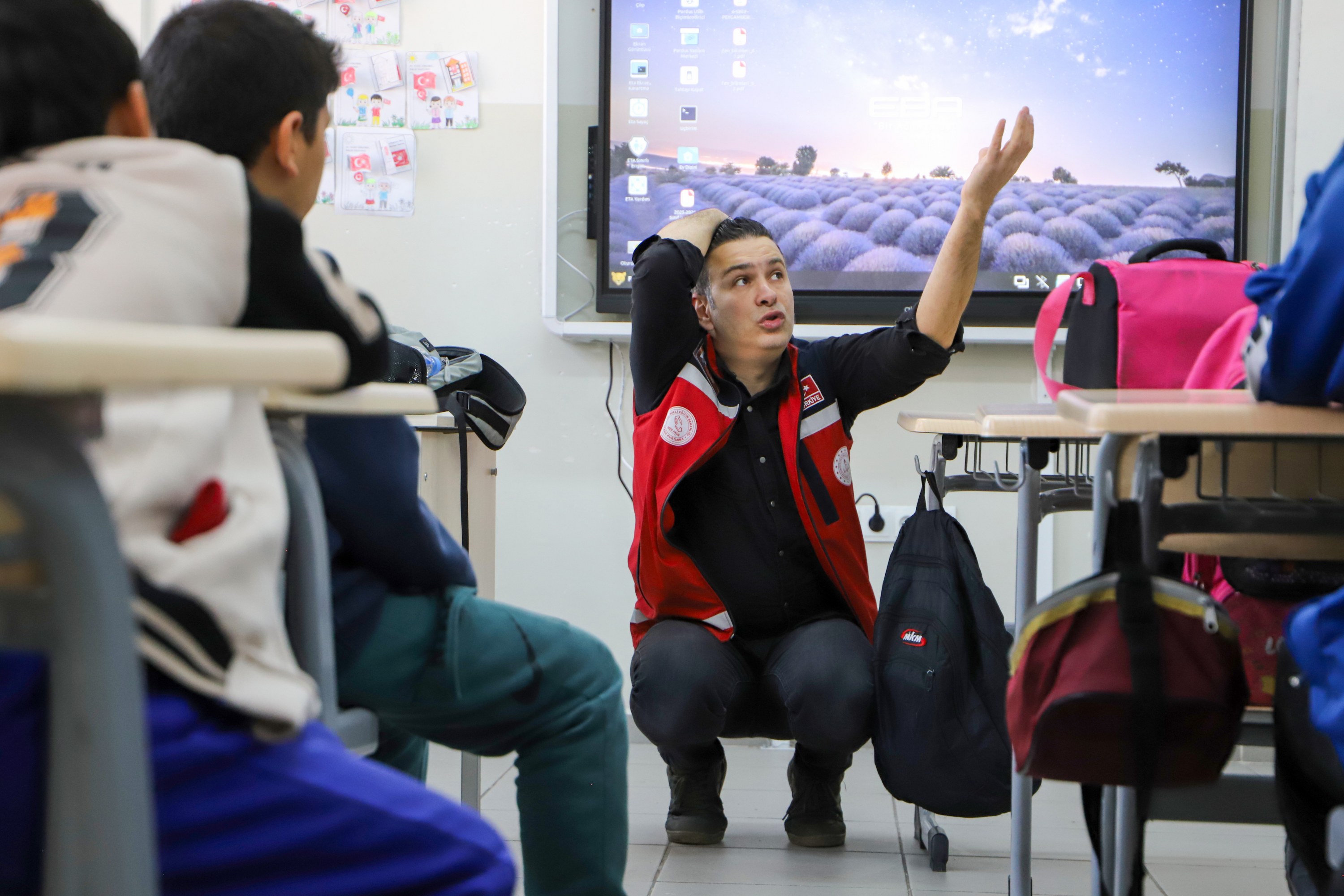 Tatbikat uygulamasından önce lise öğrencilerine, başta deprem olmak üzere afet durumlarında neler yapılması gerektiğine ilişkin üç ayrı ekip tarafından üç farklı sınıfta bilgilendirme yapıldı.