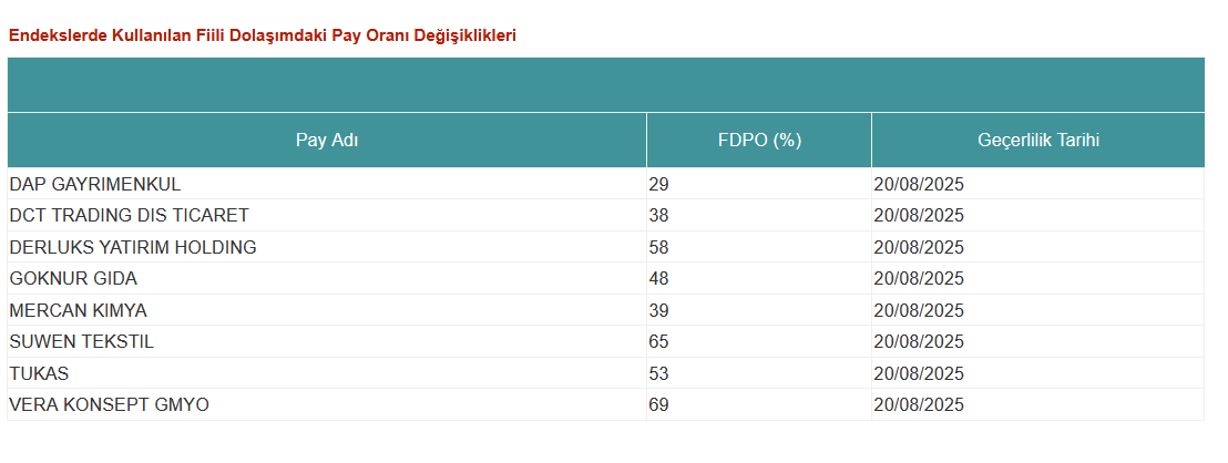 Endekslerde kullanılan fiili dolaşımdaki pay oranı değişikliklerine ilişkin bildirim yapıldı.