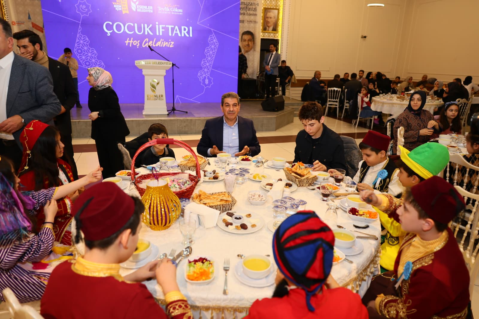 Ramazanın bereketini aynı sofrada paylaşan 500 çocuk, Esenler Kültür Merkezi’nde bir araya geldi. Programa katılan M. Tevfik Göksu, masaları tek tek ziyaret ederek çocukların Ramazan-ı Şerif’ini tebrik etti ve onlarla hatıra fotoğrafları çektirdi. Çocuklara geleneksel “diş kirası” hediyeleri de takdim edildi.