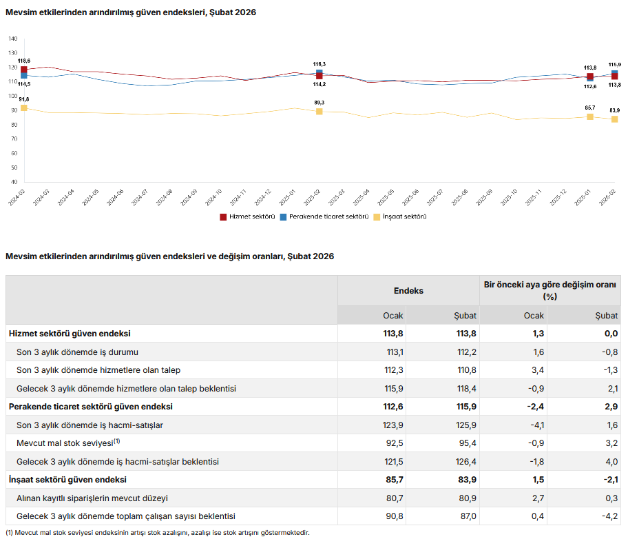 Mevsim etkilerinden arındırılmış güven endeksi Şubat ayında aylık bazda perakende ticaret sektöründe yüzde 2,9 artarak 115,9 değerine yükseldi.