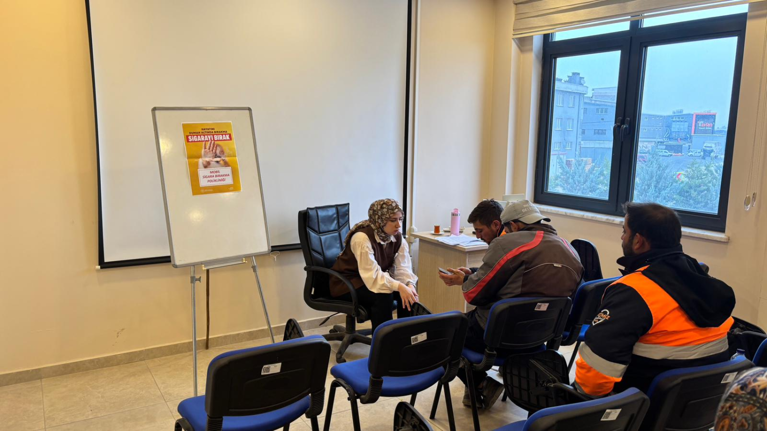 Program kapsamında görev alan mobil sigara bırakma polikliniği ekibinde bulunan Dr. Neslihan Candan ve hemşire Aysel Aydemir tarafından belediye personeline sigarayı bırakmak için psikososyal destek verildi.