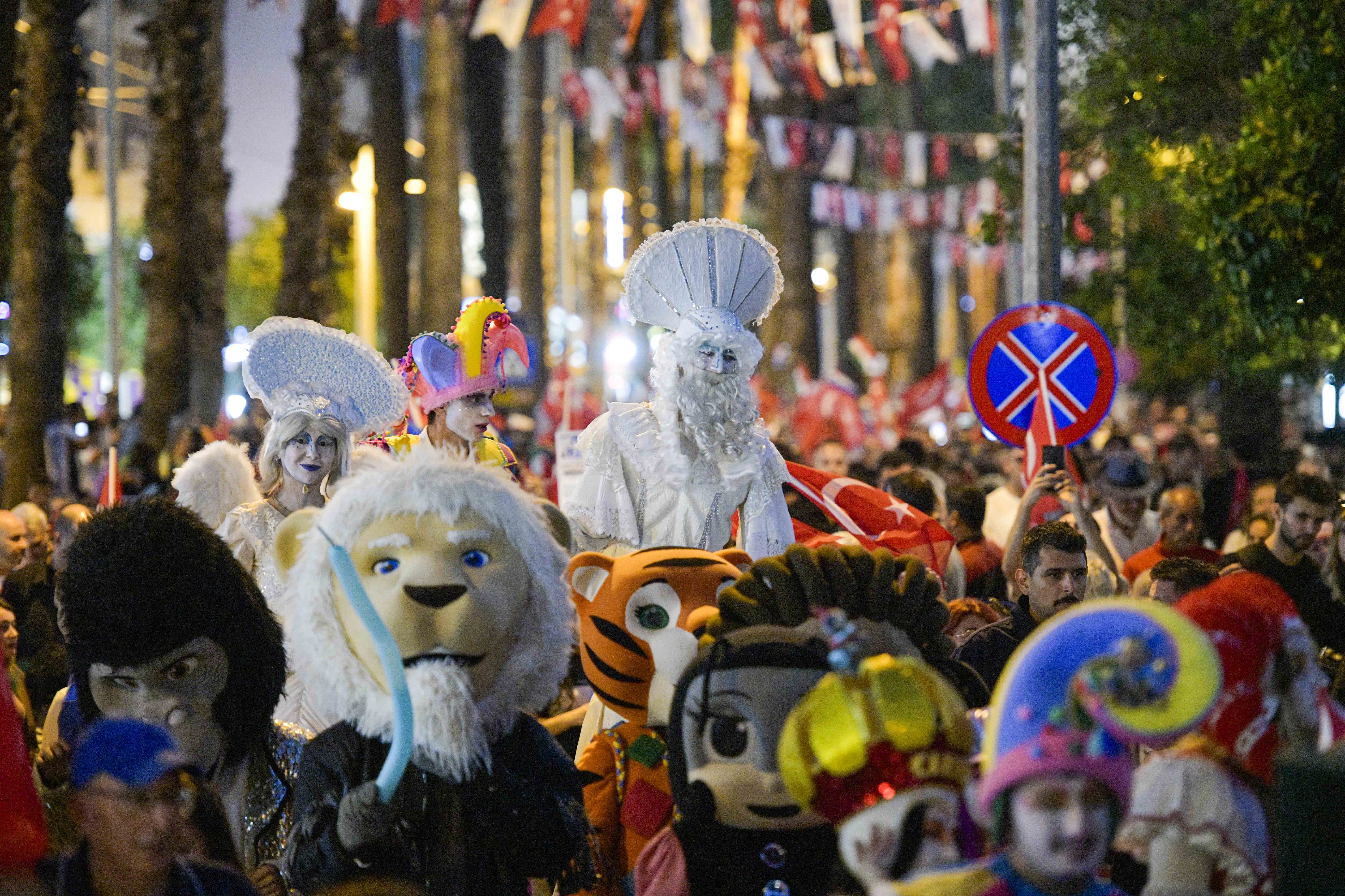 Başkan Uysal’ın konuşmasının ardından, festivale katılan şehirler, geleneksel kostümleri, ellerinde kendi ülkelerinin bayrakları ve Türk bayraklarıyla sahnede Antalyalıları selamladı.
