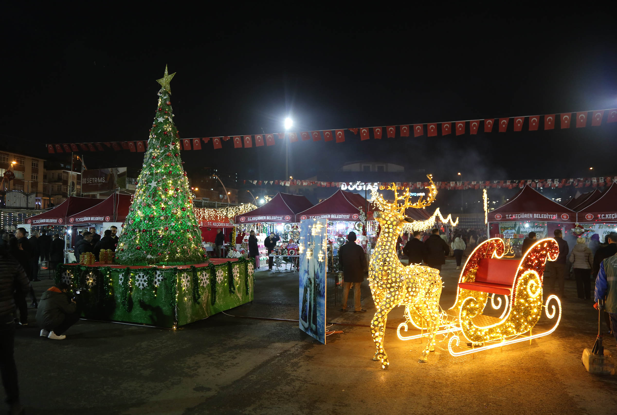 Pazar alanı; özel ışıklandırmalar, yılbaşı ağaçları ve geyik figürlü ışık süslemeleriyle donatılarak yeni yıl atmosferine uygun hale getirildi.