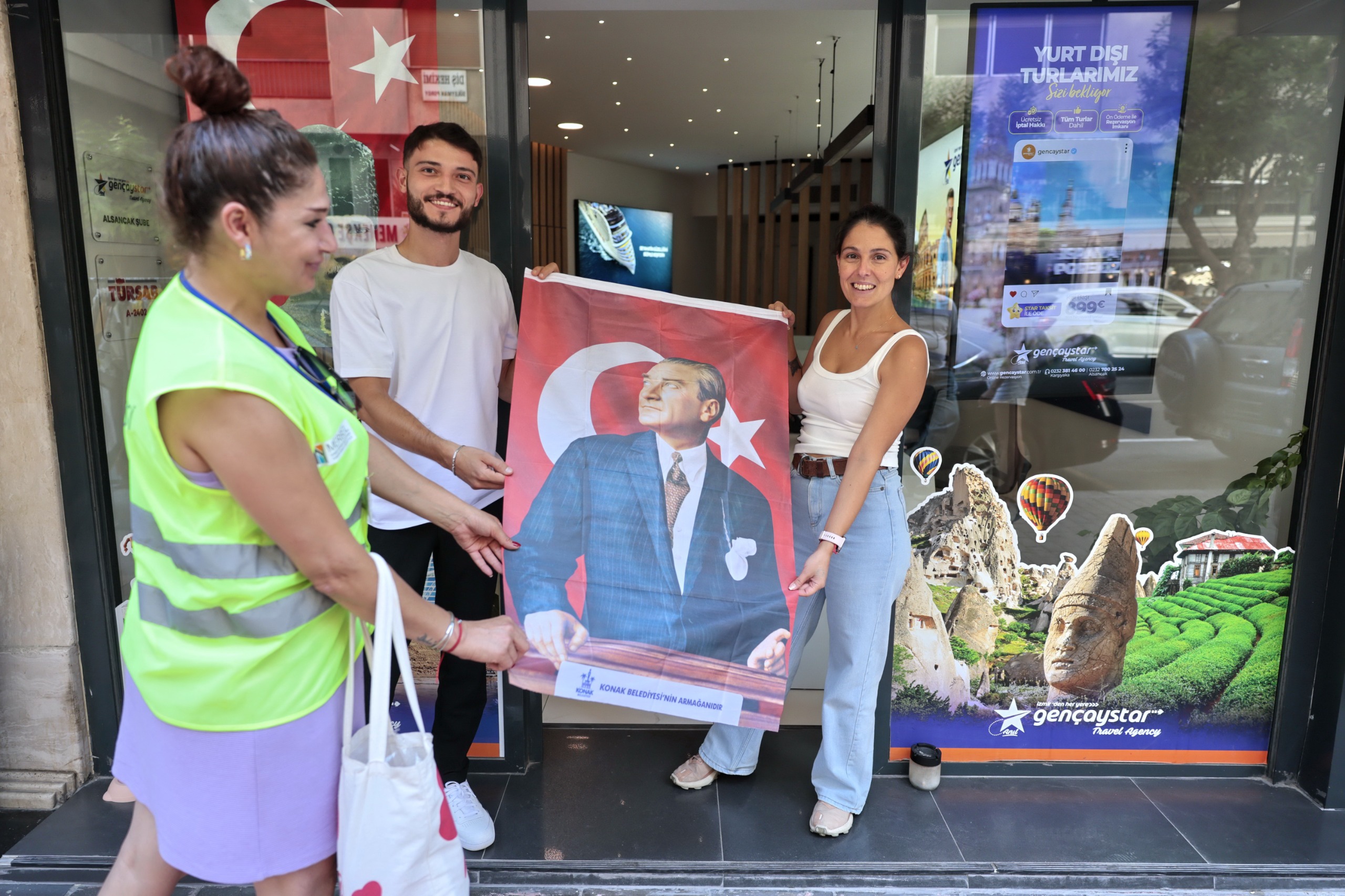 Konak Belediyesi, 30 Ağustos Zafer Bayramı dolayısıyla ilçe genelindeki esnafa üzerinde Ulu Önder Mustafa Kemal Atatürk’ün resminin bulunduğu Türk bayrağı dağıttı.