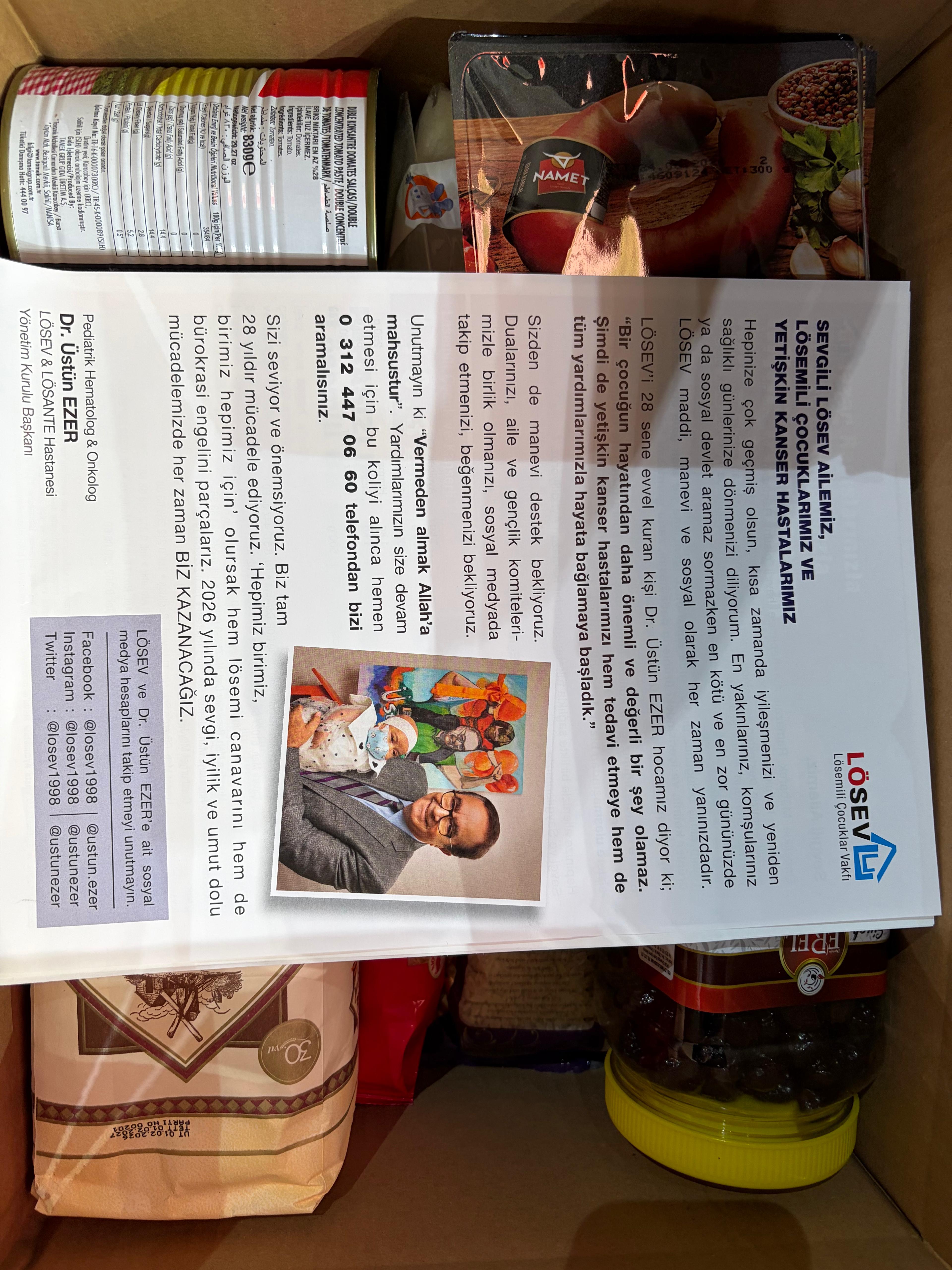 Türkiye’nin en güvenilen ve çalışkan Vakfı olan LÖSEV ile bağışların her kuruşunun ve her lokmasının yerini bulduğu, paylaşmanın ve dayanışmanın daha da önem kazandığı Mübarek Ramazan ayında, ihtiyacı olan Lösemili Çocuklar ile Yetişkin Kanser hastalarına iletilmek üzere, siz de doğal ve sağlıklı markaların ürünleri ile hazırlanmış LÖSEV GIDA PAKETLERİNİ seçebilir, sipariş verebilir, hastalarımızın yüzlerindeki gülümsemeye ortak olabilirsiniz.