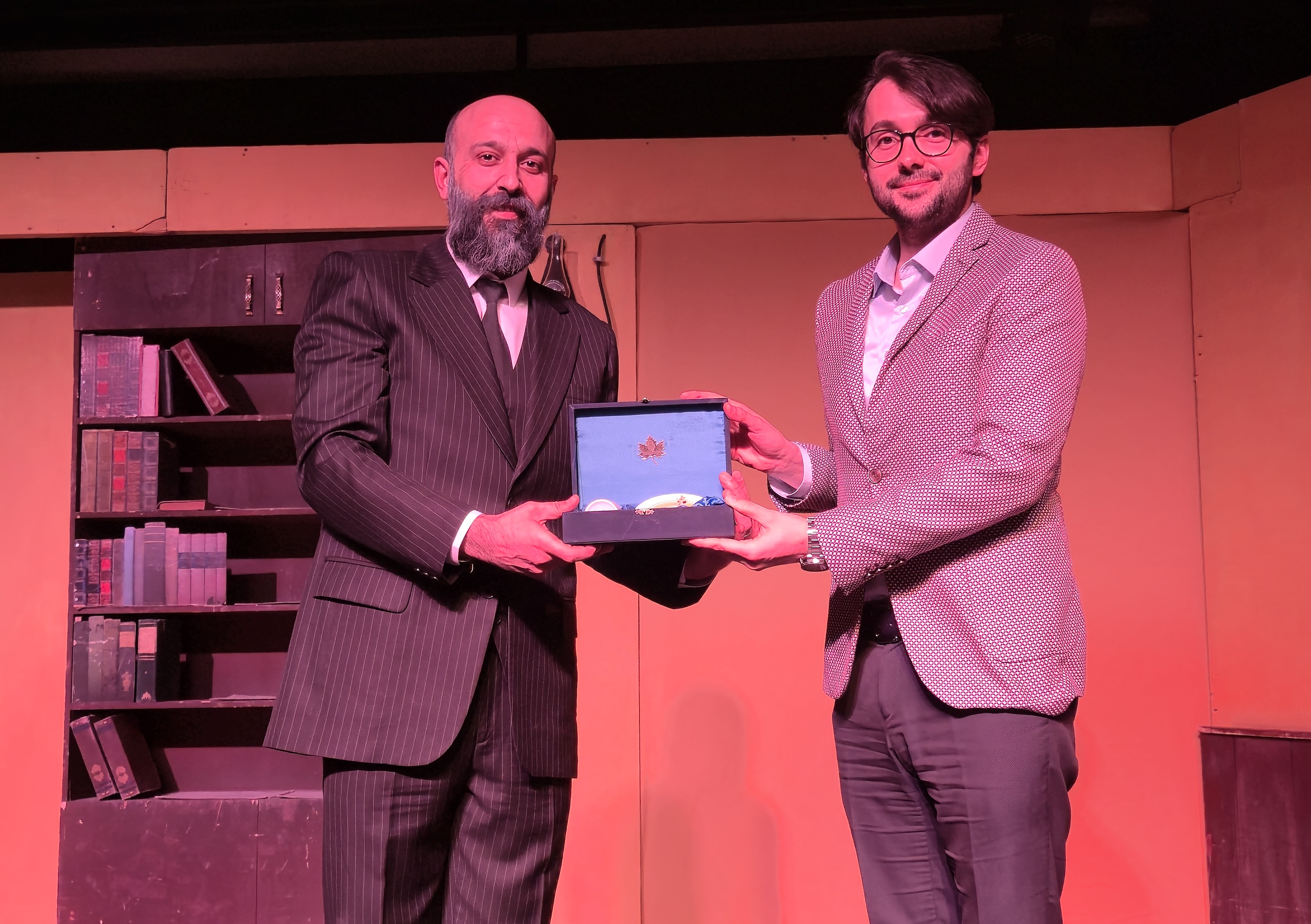İzleyiciler arasında yer alan İnegöl Belediye Başkan Yardımcısı Melih Ateş’te Mehmet Akif Ersoy’u sahnede canlandıran Emre Nurettin Örük’e gösteri sonunda gecenin anısına hediye takdim etti.