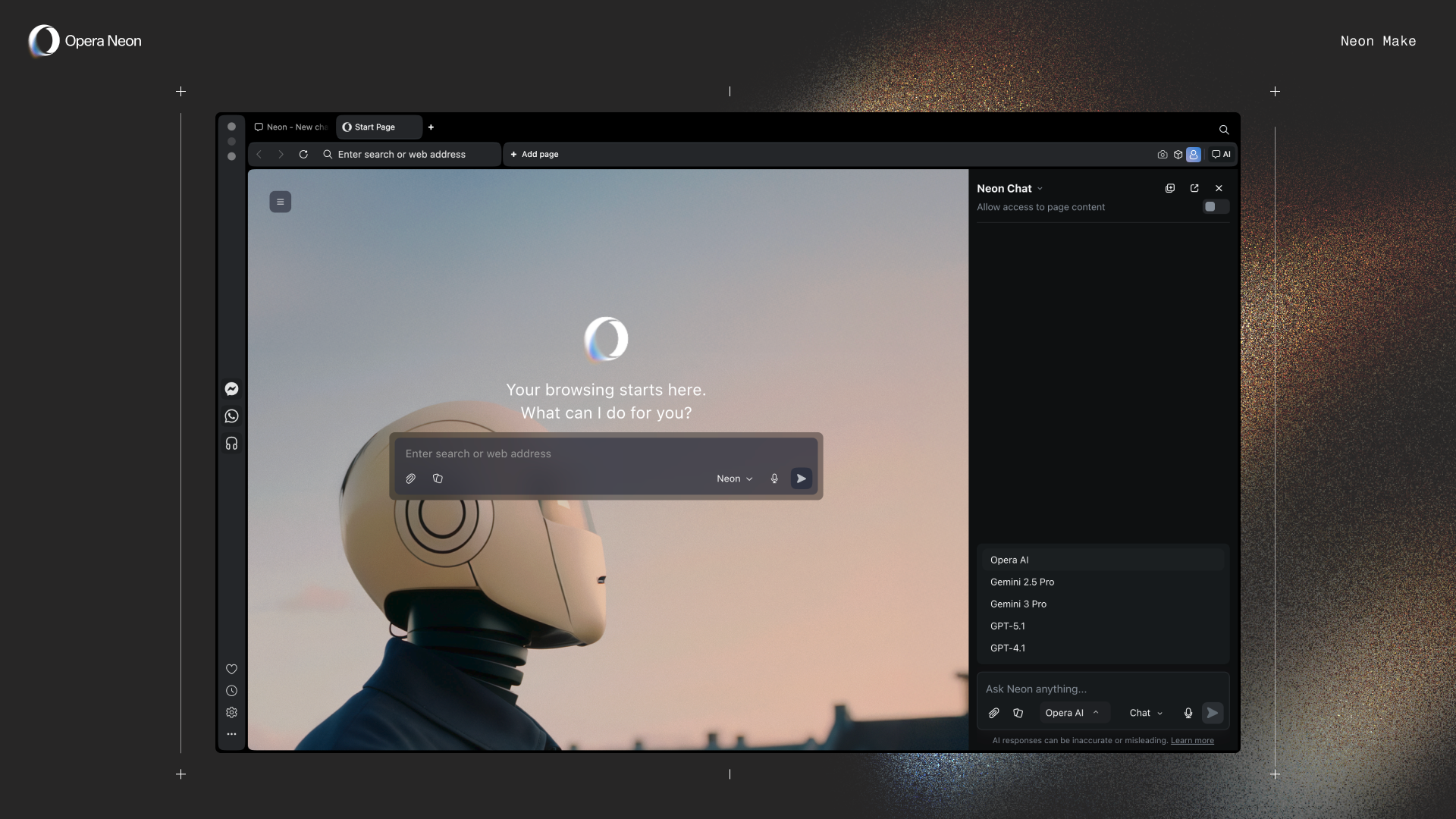 Tarayıcı, aynı zamanda Gemini 3 Pro ve GPT 5.1 gibi en güncel ve üst segment yapay zeka modellerine erişim imkanı sağlıyor. Opera Neon, Opera’nın yeni nesil yapay zeka geliştirmelerini test ettiği ve teknolojiyi erken aşamada, en ham haliyle deneyimlemeyi tercih eden kullanıcılar için oluşturduğu özel bir deneme alanı niteliği taşıyor. Bu tarayıcıya erişim, aylık 19,90 dolarlık bir abonelik modeliyle sunuluyor.