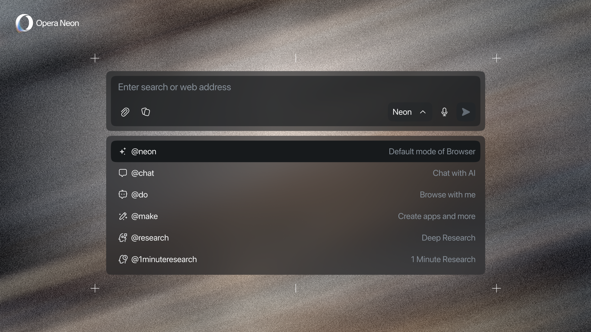 Opera Neon, yapay zeka teknolojilerini yoğun biçimde kullanan ileri seviye kullanıcılar için tasarlanmış ajan tabanlı bir tarayıcı. Geleneksel tarayıcıların ötesinde işlevler sunan Opera Neon, yapay zeka ajanları aracılığıyla kullanıcılar adına görevler yerine getirebiliyor ve web uygulamaları geliştirebiliyor.