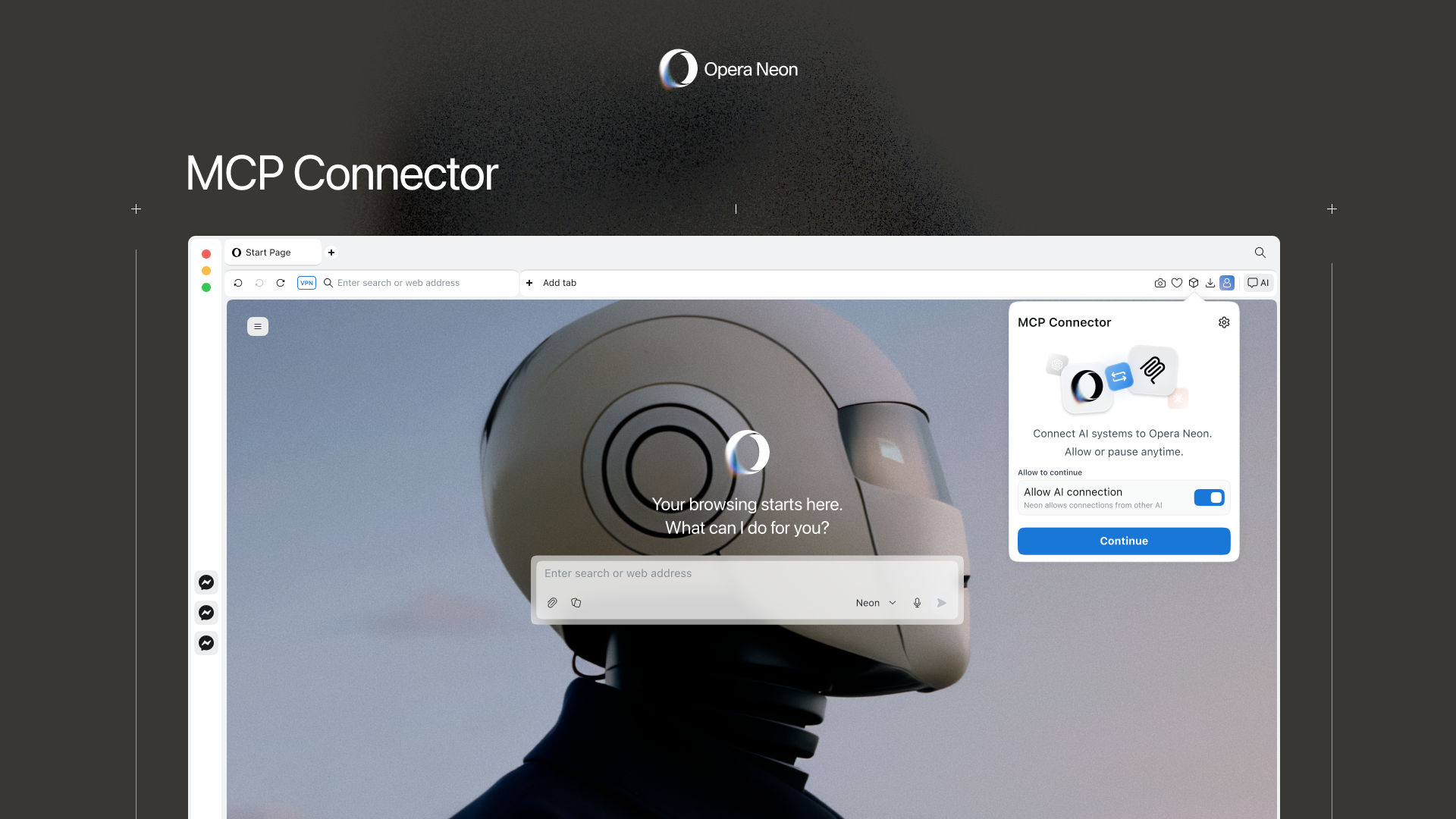 Norveç merkezli tarayıcı ve ajan yapay zekâ şirketi Opera, Opera Neon tarayıcısı için geliştirilen MCP Connector özelliğini duyurdu. Yeni özellik, harici yapay zekâ istemcilerinin doğrudan tarayıcıya bağlanmasını, canlı web bağlamına erişmesini ve tarayıcı içinde işlem yapmasını sağlıyor. Bu yenilikle birlikte kullanıcıların web bağlamını artık yapay zekâya taşımasına gerek kalmadan, yapay zekâ araçları doğrudan işin gerçekleştiği tarayıcının içine geliyor.