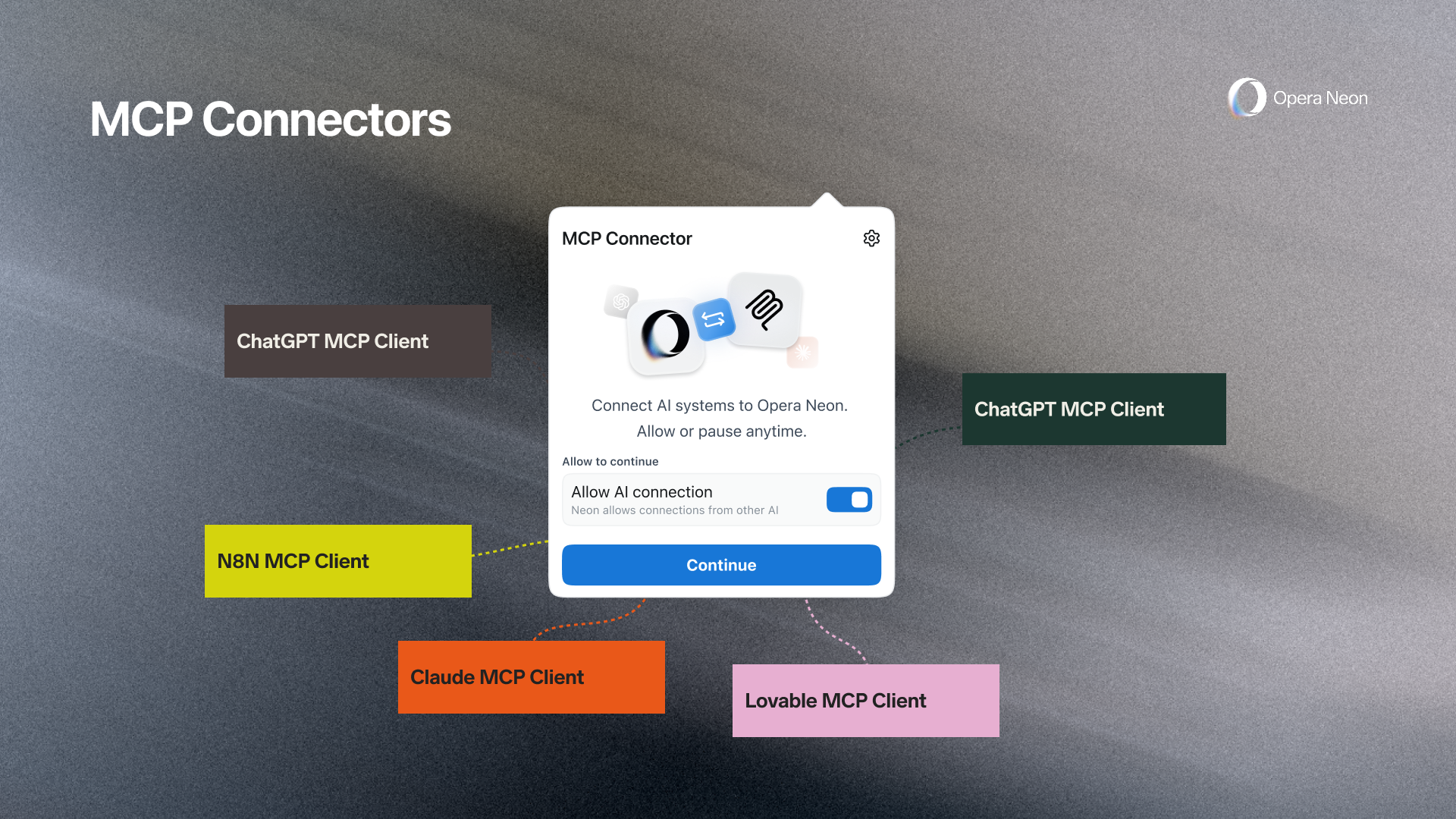 MCP Connector sayesinde Opera Neon, tarayıcıyı çok sayıda yapay zekâ istemcisine açıyor. Claude, ChatGPT, Lovable, OpenClaw ve n8n gibi popüler araçlar ile MCP uyumlu diğer istemciler doğrudan tarayıcıya bağlanabiliyor. Böylece tarayıcı etrafında açık bir yapay zekâ ekosistemi oluşuyor.