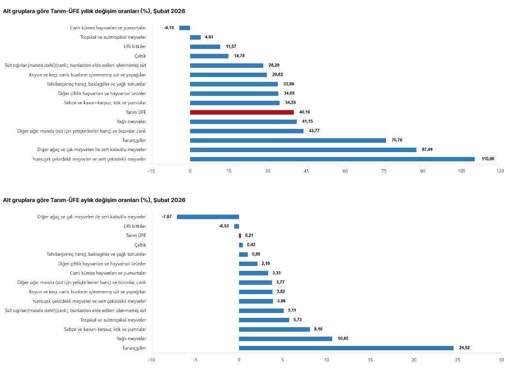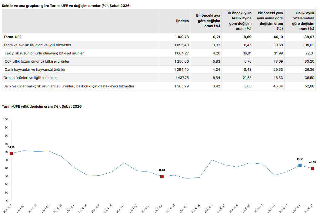 Türkiye İstatistik Kurumu’nun (TÜİK) verilerine göre, Tarım-ÜFE’de, Şubat’ta aylık bazda yüzde 0,21, bir önceki yılın Aralık ayına göre yüzde 8,69, yıllık bazda yüzde 40,10 ve on iki aylık ortalamalara göre yüzde 38,97 arttı.