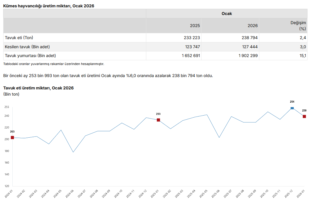 Türkiye İstatistik Kurumu’nun (TÜİK) verilerine göre, Ocak’ta yıllık bazda, tavuk yumurtası üretimi yüzde 15,1, kesilen tavuk sayısı yüzde 3,0, tavuk eti üretimi yüzde 2,4 arttı.