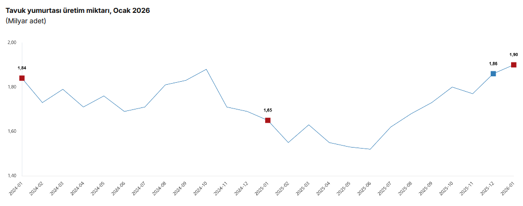 Bir önceki ay 1 milyar 860 milyon 594 bin adet olan tavuk yumurtası üretimi Ocak ayında yüzde 2,2 artarak 1 milyar 902 milyon 299 bin adete yükseldi.
