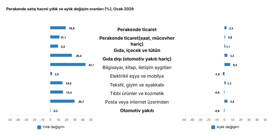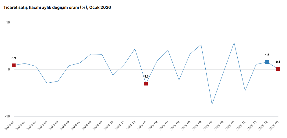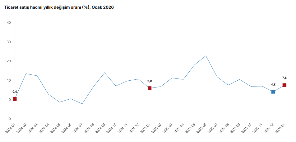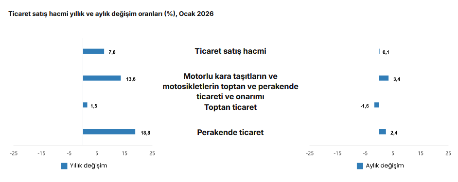 Türkiye İstatistik Kurumu’nun (TÜİK) verilerine göre, Ticaret satış hacmi (2021=100) 2026 yılı Ocak ayında bir önceki yılın aynı ayına göre yüzde 7,6 arttı. Aynı ayda motorlu kara taşıtlarının ve motosikletlerin toptan ve perakende ticareti ile onarımı için satış hacmi yüzde 13,6, toptan ticaret satış hacmi yüzde 1,5, perakende ticaret satış hacmi ise yüzde 18,8 arttı.