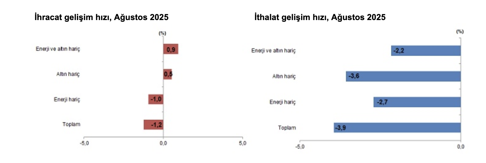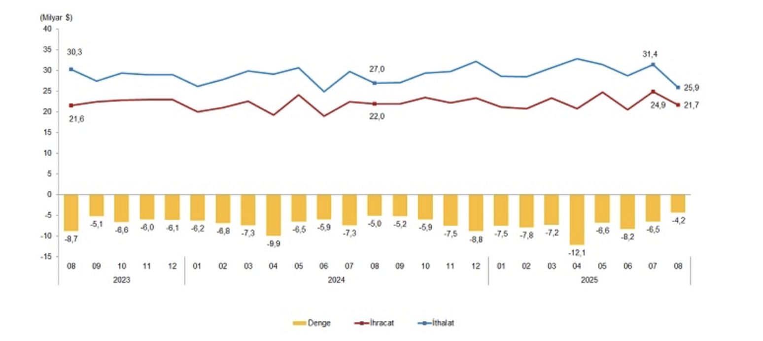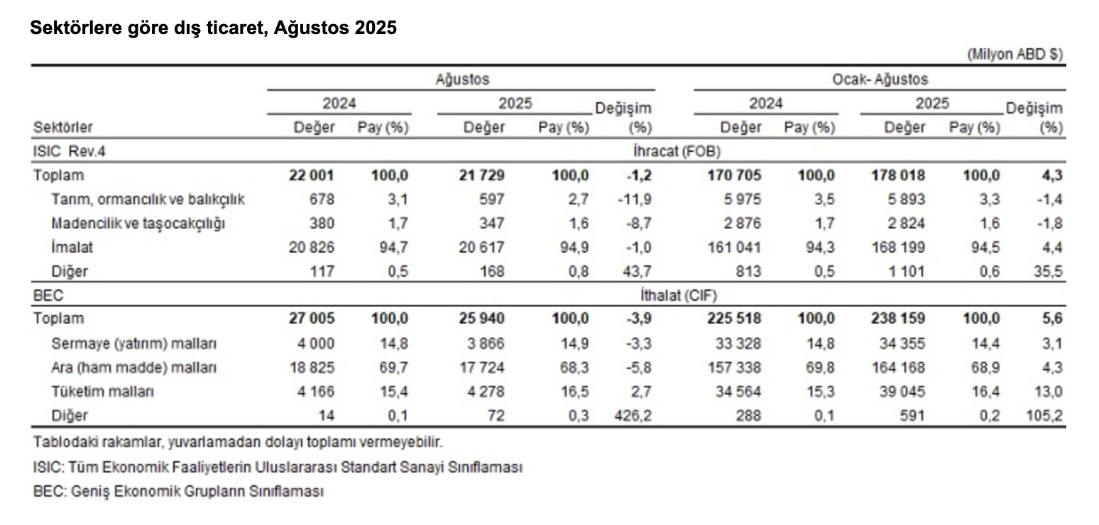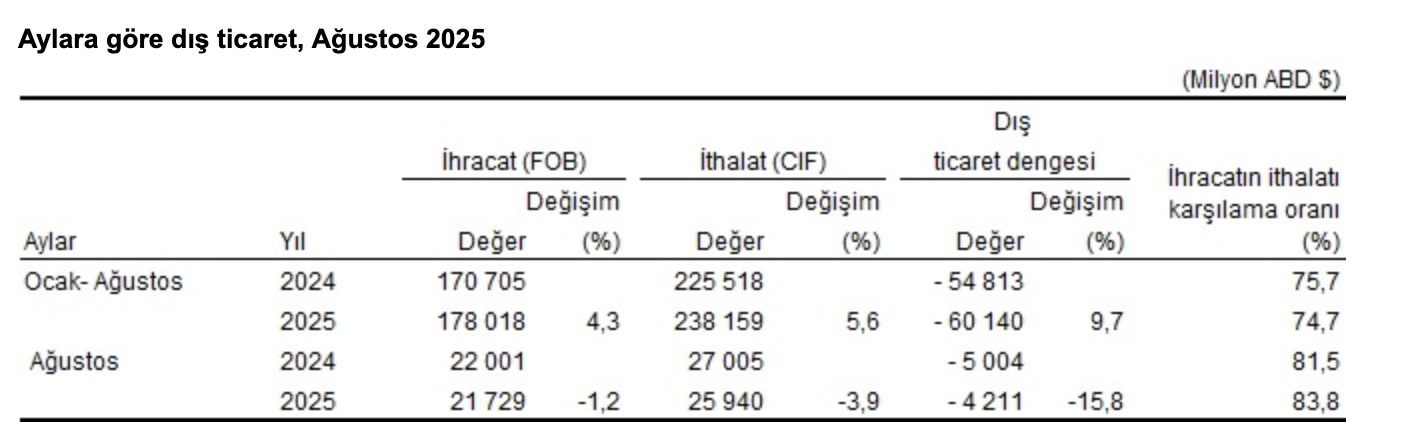 Türkiye İstatistik Kurumu ile Ticaret Bakanlığı iş birliğiyle genel ticaret sistemi kapsamında üretilen geçici dış ticaret verilerine göre; ihracat 2025 yılı Ağustos ayında, bir önceki yılın aynı ayına göre %1,2 azalarak 21 milyar 729 milyon dolar, ithalat %3,9 azalarak 25 milyar 940 milyon dolar olarak gerçekleşti.