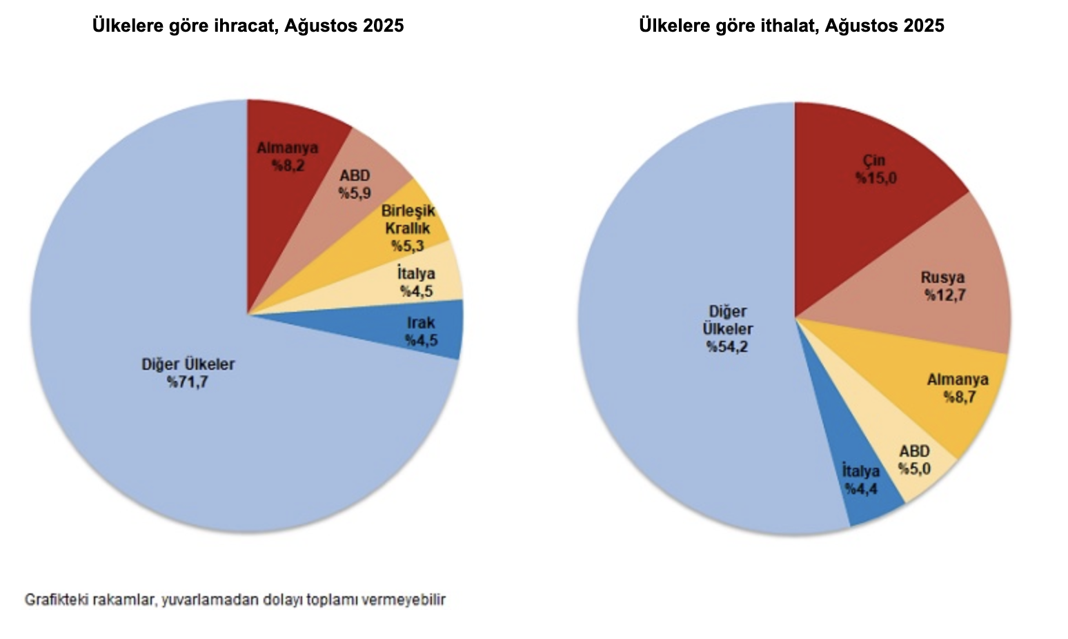 İthalatta Çin ilk sırayı aldı. Ağustos ayında Çin'den yapılan ithalat 3 milyar 899 milyon dolar olurken, bu ülkeyi sırasıyla; 3 milyar 286 milyon dolar ile Rusya Federasyonu, 2 milyar 258 milyon dolar ile Almanya, 1 milyar 301 milyon dolar ile ABD, 1 milyar 148 milyon dolar ile İtalya izledi. İlk 5 ülkeden yapılan ithalat, toplam ithalatın yüzde 45,8'ini oluşturdu.