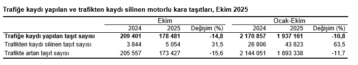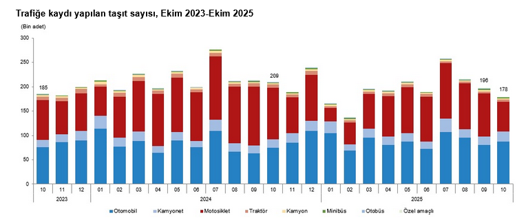 Türkiye İstatistik Kurumu (TÜİK) verilerine göre, Ekim ayında trafiğe kaydı yapılan taşıt sayısı bir önceki aya göre kamyonette yüzde 18,3, otomobilde yüzde 9,0, kamyonda yüzde 7,1, traktörde yüzde 3,9 artarken minibüste yüzde 44,2, motosiklette yüzde 30,8, otobüste yüzde 19,0 ve özel amaçlı taşıtta yüzde 12,0 azaldı.
