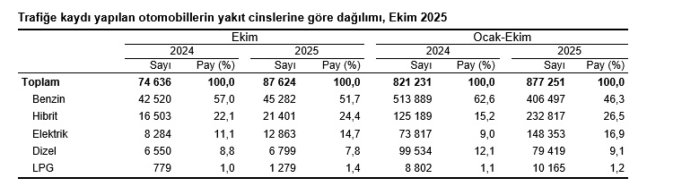 Ocak-Ekim döneminde trafiğe kaydı yapılan 877 bin 251 adet otomobilin yüzde 46,3'ü benzin, yüzde 26,5'i hibrit, yüzde 16,9'u elektrikli, yüzde 9,1'i dizel ve yüzde 1,2'si LPG yakıtlıdır. Ekim ayı sonu itibarıyla trafiğe kayıtlı 17 milyon 117 bin 983 adet otomobilin ise yüzde 32,9'u dizel, yüzde 30,8'i benzin, yüzde 30,5'i LPG, yüzde 3,6'sı hibrit ve yüzde 1,9'u elektriklidir. Yakıt türü bilinmeyen(3) otomobillerin oranı ise yüzde 0,2'dir.