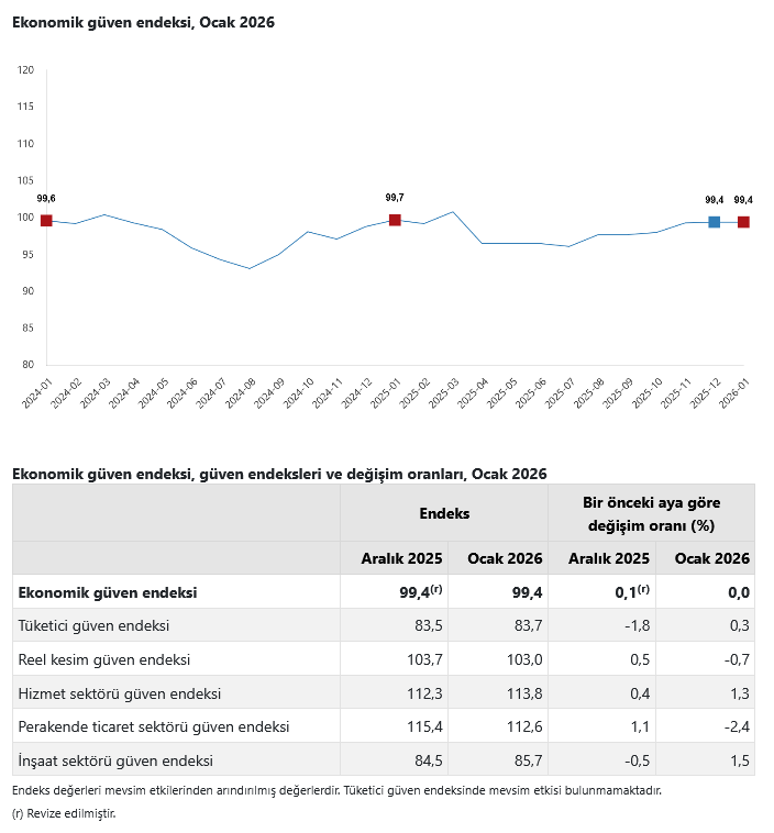 Türkiye İstatistik Kurumu’nun (TÜİK) verilerine göre, ekonomik güven endeksi Ocak ayında aynı düzeyde kalarak 99,4 değerini aldı.