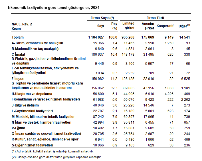 Türkiye İstatistik Kurumu (TÜİK) verilerine göre, Sektör Bilançoları enflasyon düzeltmesi uygulanmış 2024 yılı sonuçlarına göre 1 milyon 104 bin 27 firma sayısının sektörlere göre dağılımında, toptan ve perakende ticaret; motorlu kara taşıtlarının ve motosikletlerin onarımı sektörü 356 bin 62 ile en başta yer aldı.