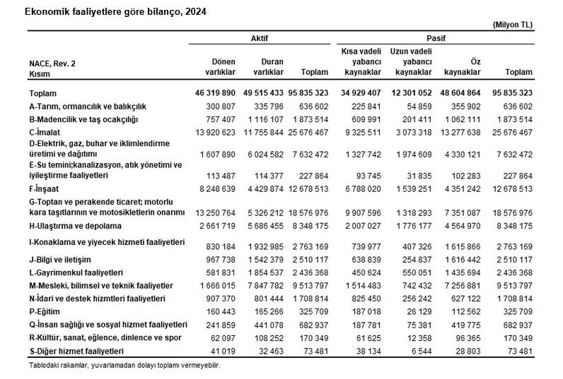 Firmaların toplulaştırılmış bilançosuna göre, 2024 yılında toplam aktif büyüklüğü 95 trilyon 835 milyar 323 milyon TL, kısa ve uzun vadeli yabancı kaynaklar toplamı ise 47 trilyon 230 milyar 459 milyon TL olurken, öz kaynakların toplamı 48 trilyon 604 milyar 864 milyon TL oldu.