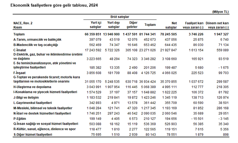 Firmaların toplulaştırılmış gelir tablosu verisine göre, 2024 yılında tüm sektörlerin toplulaştırılmış dönem net karı 1 trilyon 947 milyar 327 milyon TL olarak gerçekleşti. İmalat sektörü 559 milyar 89 milyon TL ile en yüksek net kar elde eden sektör oldu. Toptan ve perakende ticaret; motorlu kara taşıtlarının ve motosikletlerin onarımı sektörü 299 milyar 587 milyon TL, mesleki, bilimsel ve teknik faaliyetler sektörü ise 286 milyar 168 milyon TL net kar elde etti. Eğitim sektörü 2024 yılını 3 milyar 145 milyon TL, su temini; kanalizasyon, atık yönetimi ve iyileştirme faaliyetleri sektörü ise 1 milyar 675 milyon TL net zarar ile tamamladı.