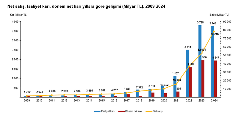 Sektör Bilançoları kapsamında bulunan tüm firmaların 2024 yılı toplam net satışları 78 trilyon 245 milyar 505 milyon TL,  toplam faaliyet karı ise 3 trilyon 746 milyar 226 milyon TL olarak gerçekleşti.
