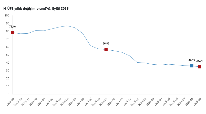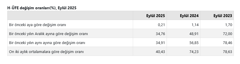 Türkiye İstatistik Kurumu’nun (TÜİK) verilerine göre, H-ÜFE 2025 yılı Eylül ayında bir önceki aya göre yüzde 0,21, bir önceki yılın Aralık ayına göre yüzde 34,76, bir önceki yılın aynı ayına göre yüzde 34,91 ve on iki aylık ortalamalara göre yüzde 40,43 yükseldi.