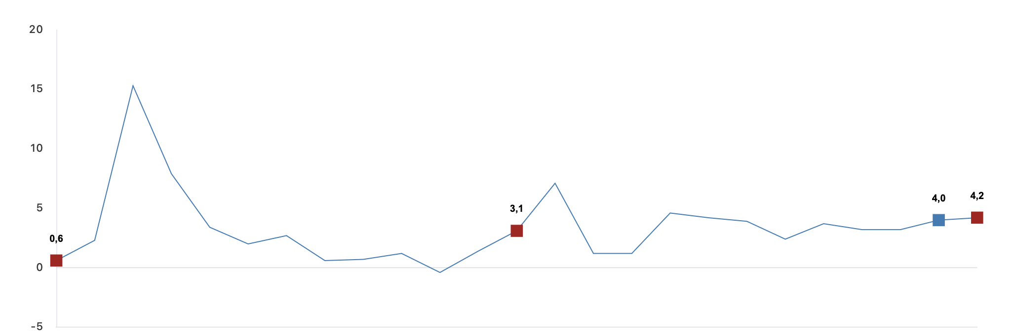 Türkiye İstatistik Kurumu’nun (TÜİK) verilerine göre, aynı ayda ulaştırma ve depolama hizmetleri yüzde 3,5 arttı, konaklama ve yiyecek hizmetleri yüzde 5,2 arttı, bilgi ve iletişim hizmetleri yüzde 5,0 arttı, gayrimenkul hizmetleri yüzde 0,5 azaldı, mesleki, bilimsel ve teknik hizmetler yüzde 3,0 arttı, idari ve destek hizmetleri ise yüzde 4,6 arttı.