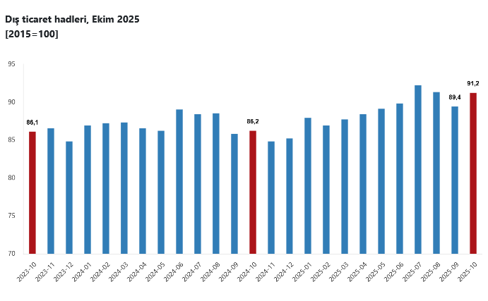 İhracat birim değer endeksinin ithalat birim değer endeksine bölünmesiyle hesaplanan ve 2024 yılı Ekim ayında 86,2 olarak elde edilmiş olan dış ticaret haddi, 5,0 puan artarak, 2025 yılı Ekim ayında 91,2 oldu.
