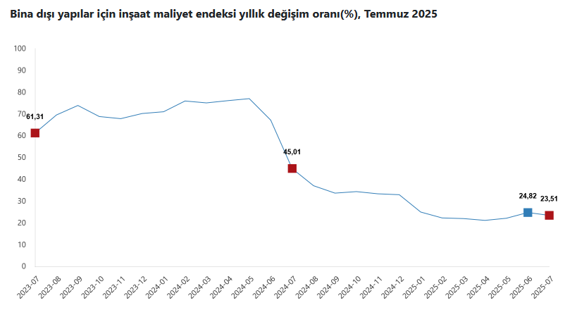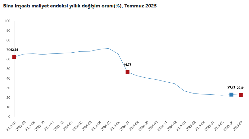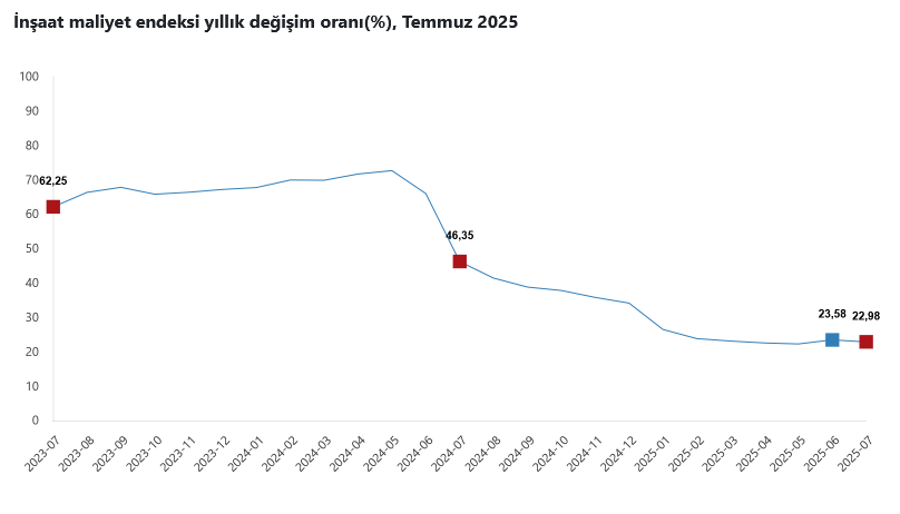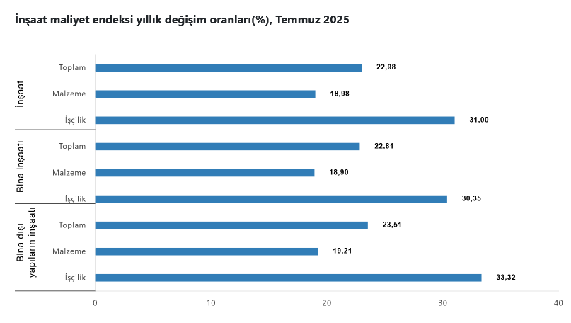Türkiye İstatistik Kurumu’nun (TÜİK) verilerine göre, İnşaat maliyet endeksi, 2025 yılı Temmuz ayında bir önceki aya göre yüzde 1,41, bir önceki yılın aynı ayına göre yüzde 22,98 yükseldi.