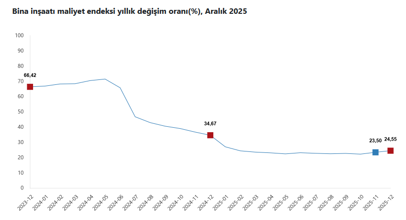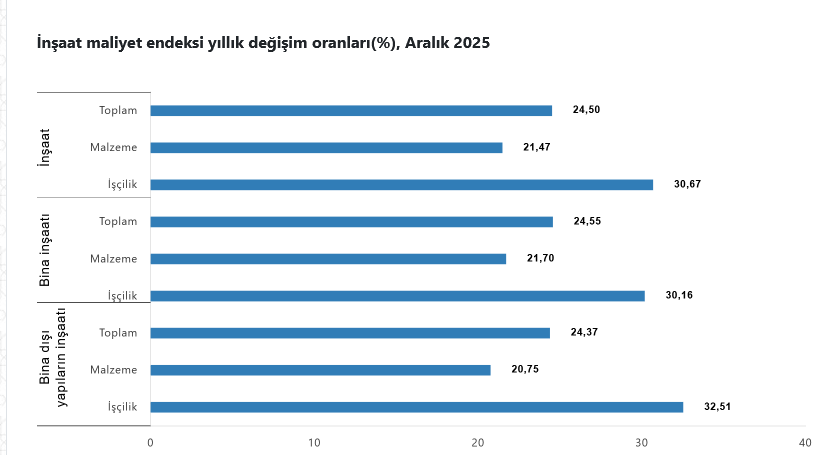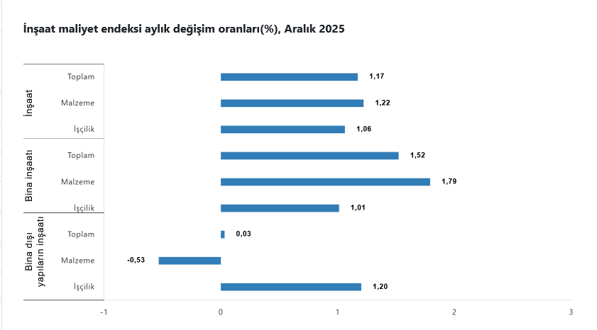 Türkiye İstatistik Kurumu (TÜİK) verilerine göre, İnşaat maliyet endeksi, 2025 yılı Aralık ayında bir önceki aya göre yüzde 1,17 arttı, bir önceki yılın aynı ayına göre yüzde 24,50 arttı. Bir önceki aya göre malzeme endeksi yüzde 1,22 arttı, işçilik endeksi yüzde 1,06 arttı. Ayrıca bir önceki yılın aynı ayına göre malzeme endeksi yüzde 21,47 arttı, işçilik endeksi yüzde 30,67 arttı.