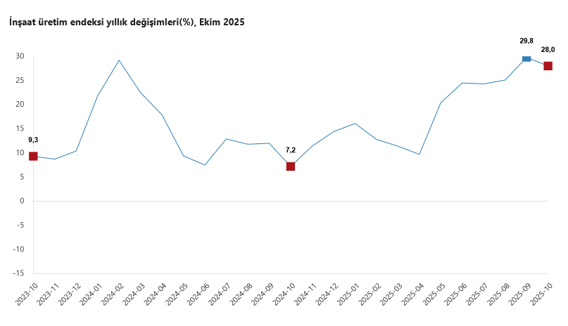 Türkiye İstatistik Kurumu’nun (TÜİK) verilerine göre, inşaatın alt sektörleri (2021=100 referans yıllı) incelendiğinde, 2025 yılı Ekim ayında bina inşaatı sektörü endeksi bir önceki yılın aynı ayına göre yüzde 28,8, bina dışı yapıların inşaatı sektörü endeksi yüzde 21,8 ve özel inşaat faaliyetleri sektörü endeksi yüzde 29,9 yükseldi.