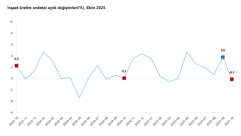 İnşaatın alt sektörleri incelendiğinde, 2025 yılı Ekim ayında bina inşaatı sektörü endeksi bir önceki aya göre yüzde 0,2 geriledi, bina dışı yapıların inşaatı sektörü endeksi yüzde 1,4 yükseldi ve özel inşaat faaliyetleri sektörü endeksi yüzde 0,6 geriledi.