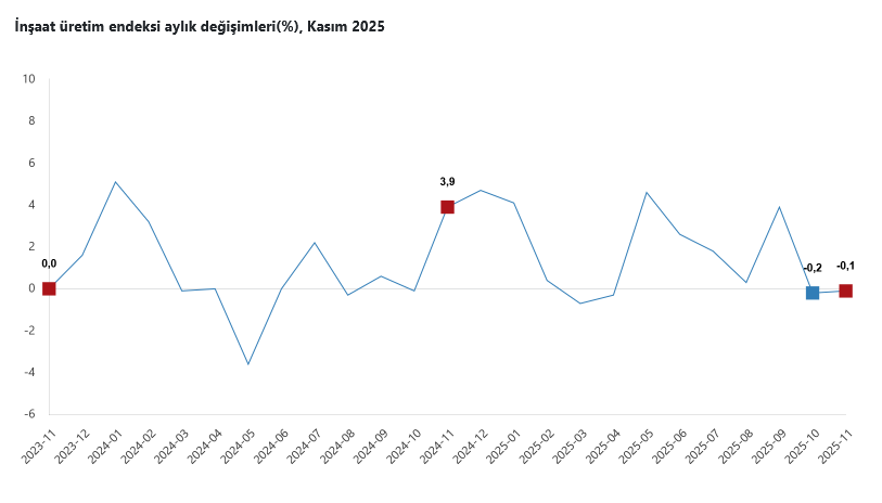 İnşaatın alt sektörleri incelendiğinde, 2025 yılı Kasım ayında bina inşaatı sektörü endeksi aylık bazda yüzde 0,3 arttı, bina dışı yapıların inşaatı sektörü endeksi yüzde 0,4 arttı ve özel inşaat faaliyetleri sektörü endeksi yüzde 1,8 azaldı.
