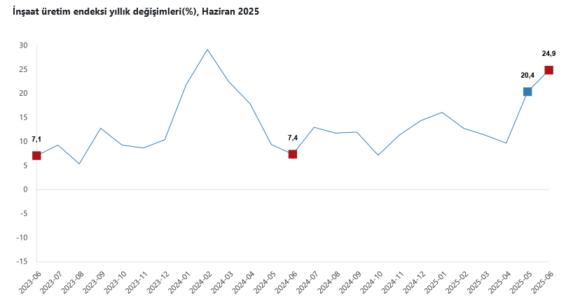 Türkiye İstatistik Kurumu’nun (TÜİK) verilerine göre; inşaatın alt sektörleri (2021=100 referans yıllı) incelendiğinde, 2025 yılı Haziran ayında bina inşaatı sektörü endeksi bir önceki yılın aynı ayına göre yüzde 26,9, bina dışı yapıların inşaatı sektörü endeksi yüzde 16,7 ve özel inşaat faaliyetleri sektörü endeksi yüzde 23,6 yükseldi.