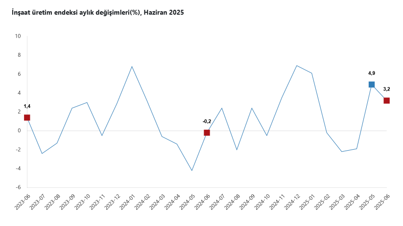 İnşaatın alt sektörleri incelendiğinde, 2025 yılı Haziran ayında bina inşaatı sektörü endeksi bir önceki aya göre yüzde 3,1, bina dışı yapıların inşaatı sektörü endeksi yüzde 3,1 ve özel inşaat faaliyetleri sektörü endeksi yüzde 3,7 yükseldi.