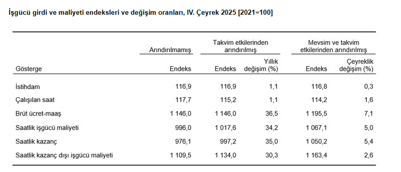 Sanayi, inşaat ve ticaret-hizmet sektörleri toplamında saatlik kazanç dışı işgücü maliyeti endeksi, 2025 yılı IV. çeyreğinde bir önceki yılın aynı çeyreğine göre yüzde 30,3 arttı. Alt sektörler incelendiğinde, endeks; sanayi sektöründe yüzde 25,9, inşaat sektöründe yüzde 33,6 ve ticaret-hizmet sektörlerinde yüzde 33,9 arttı.